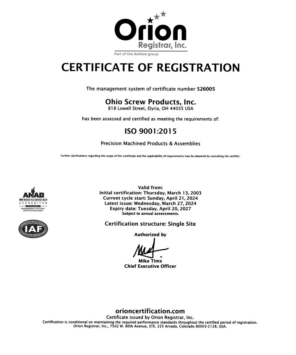 Since 1945, OSP has combined machining expertise with a culture of accountability as a 100% employee-owned company. Achieving and maintaining ISO 9001:2015 certification is a natural extension of our values — it proves our commitment to doing things the right way.